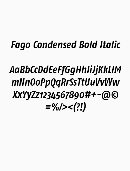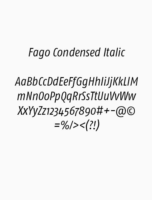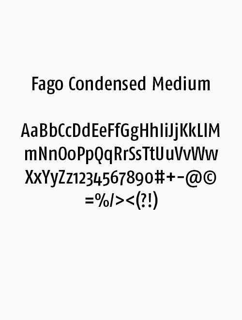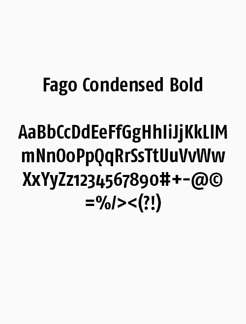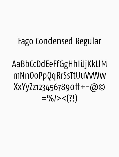 Die Fago Condensed Regular ist unsere Basisschrift und wird für Lesetexte eingesetzt. Die breiten Öffnungen erleichtern die Lesbarkeit bei kleinen Größen sowie aus der Entfernung. Für Texthervorhebungen können Sie die Fago Condensed Bold einsetzen.